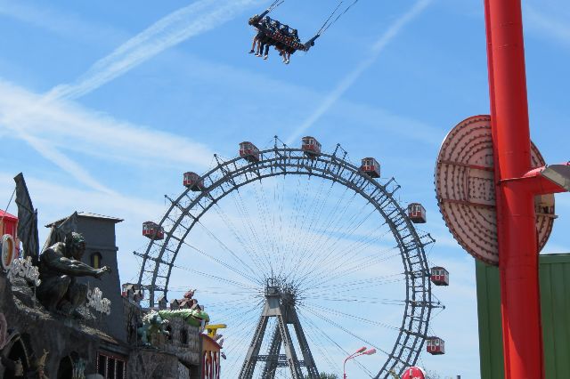 Von unten sieht das Riesenrad heute gar nicht mehr so groß aus. Die vielen anderen Prater- Attraktionen haben seine Größe etwas relativiert. Aber es bietet immer noch einzigartige Ausblicke. Vor allem bewegt es sich so langsam, dass man ohne Hektik gut fotografieren kann.